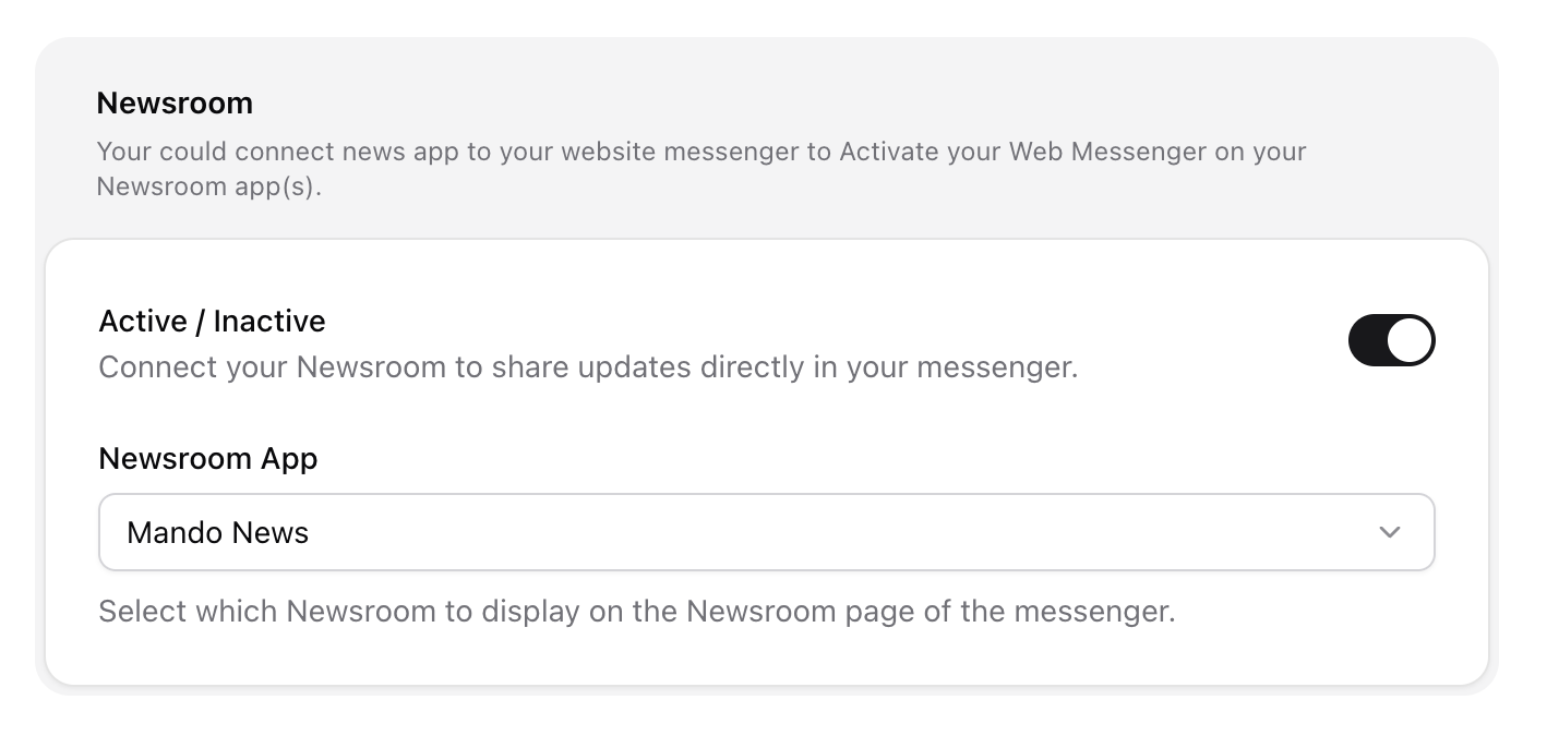 If you have a Newsroom app set up, you can showcase it inside the chatbot to share your latest announcements, updates, or blog posts. Once activated, users will be able to browse your Newsroom content without leaving the chat experience.