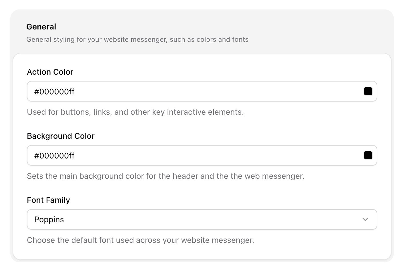 Choose a font that matches your brand style. This will be applied across all messages and headings inside the chatbot window.