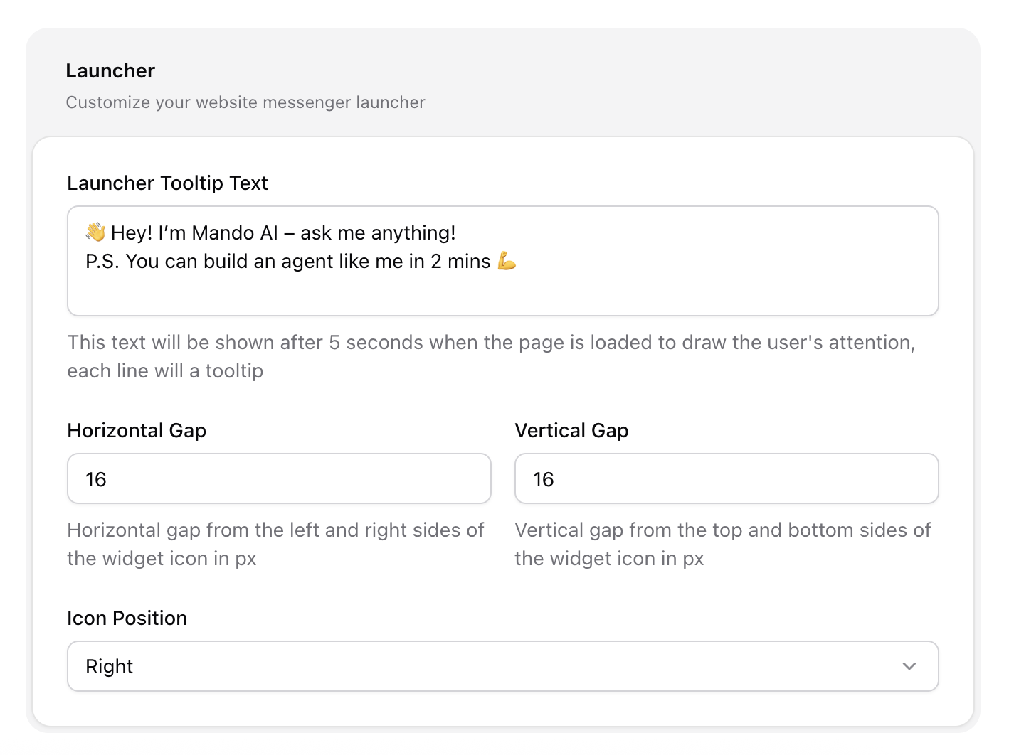 This section controls the small icon launcher/chat bubble and the tooltip messages shown to users.