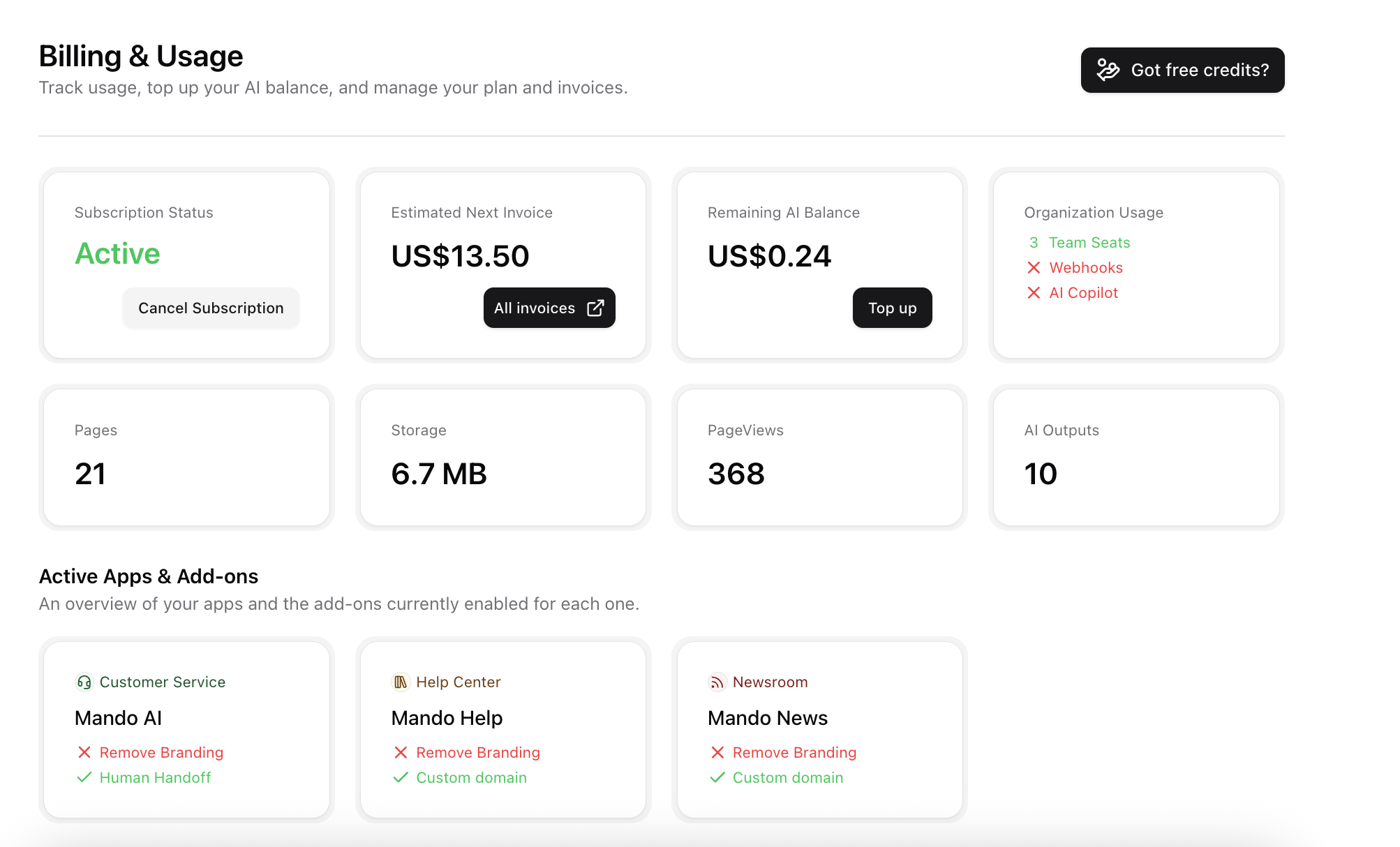 Keeping track of your usage and spend is easy with Mando. Whether you’re on a free trial or an active subscription, the Billing & Usage section gives you full visibility into your plan, AI consumption, and upcoming charges — all in one place.