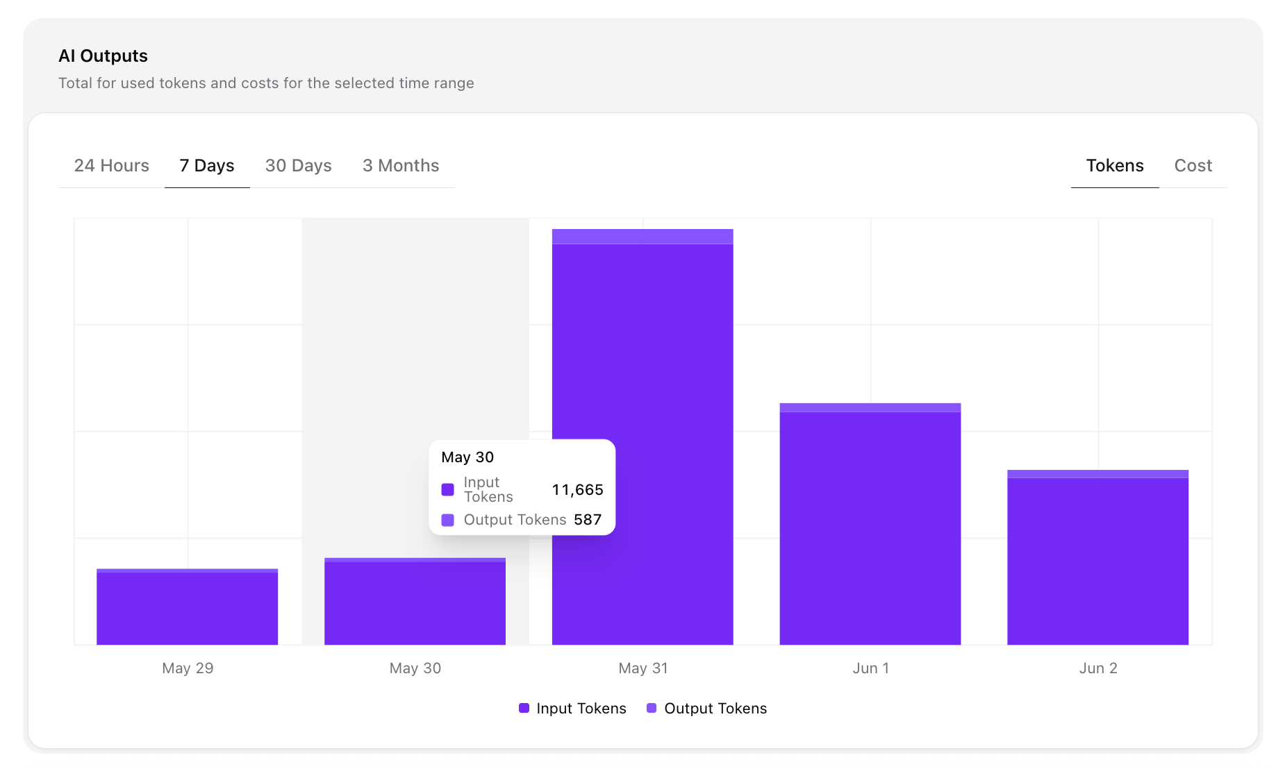 Graph View – You’ll see a visual chart of your daily AI usage over time. The graph distinguishes between input tokens (what you send to the AI) and output tokens (what the AI returns).