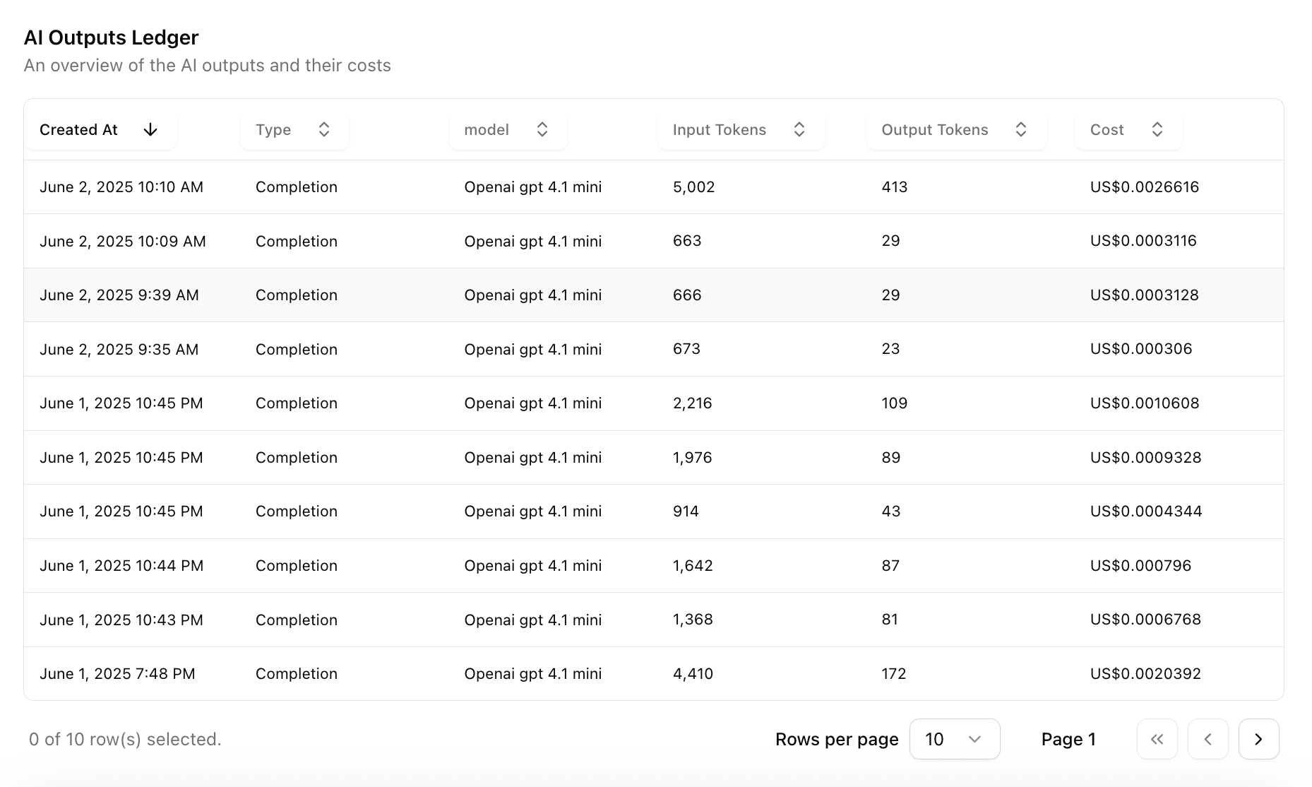 At the bottom of the page, the AI Outputs Ledger gives you a transaction-level view of each AI completion. You’ll find: