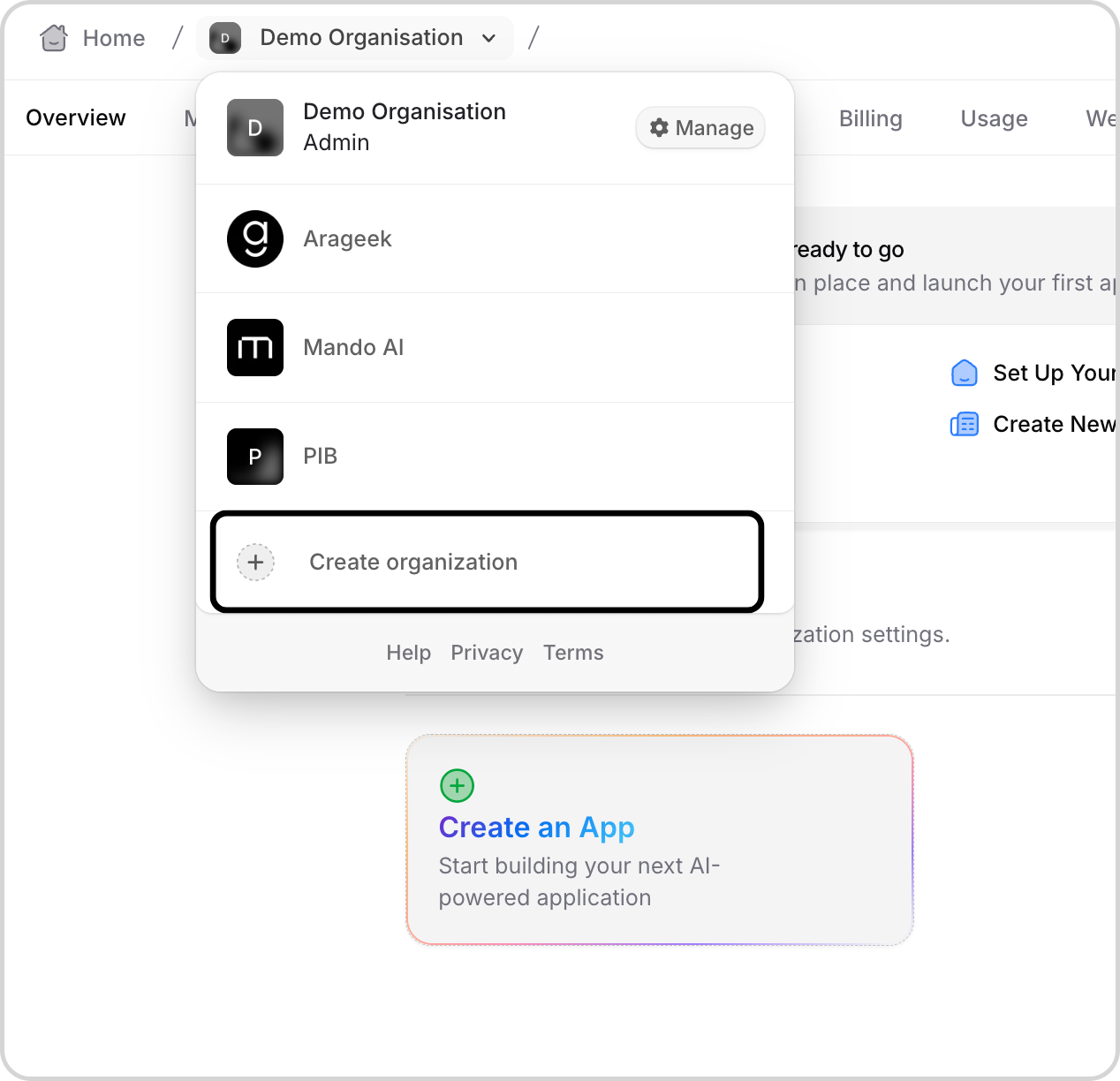 In your organisation, click Create an App (or open the creation flow from your organisation home/overview).