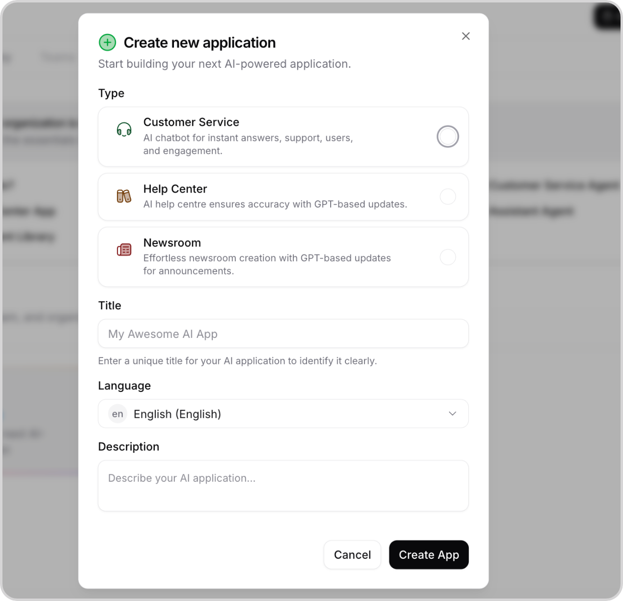 Set up a new organisation (workspace) in Mando, then create your first app (Customer Service, Help Center, or Newsroom).